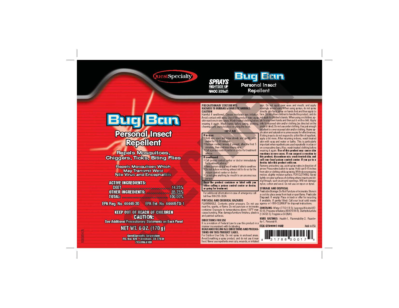 BUG BAN Insect Repellent: contains 14.25% DEET. It is effective against mosquitoes, chiggers,ticks and biting flies.